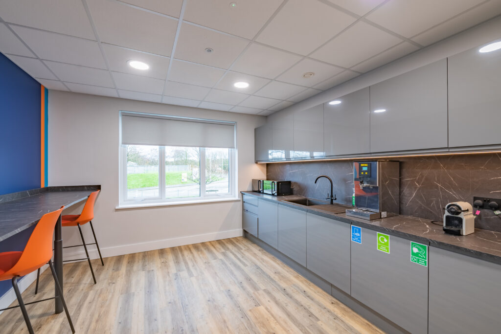 A new mezzanine floor was introduced to expand usable floor space, allowing additional office, meeting and welfare areas to be accommodated without extending the building footprint.